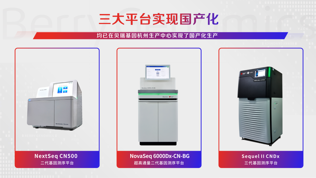 貝瑞基因目前打造了以NextSeq CN500、NovaSeq 6000Dx-CN-BG 以及 Sequel II CNDx 為代表的三大測(cè)序平臺(tái)。2019年,NextSeq CN500適用范圍變更獲得國(guó)家藥品監(jiān)督管理局批準(zhǔn),成為了適合大規(guī)模臨床基因檢測(cè)的NGS通用型平臺(tái);Sequel II CNDx 已通過(guò)技術(shù)要求檢驗(yàn),目前處于醫(yī)療器械注冊(cè)申報(bào)中的臨床試驗(yàn)階段;NovaSeq 6000Dx-CN-BG目前處于注冊(cè)檢驗(yàn)階段。自2021年起,三大平臺(tái)均已在貝瑞基因杭州生產(chǎn)基地落地生產(chǎn),實(shí)現(xiàn)了真正意義上的國(guó)產(chǎn)化。